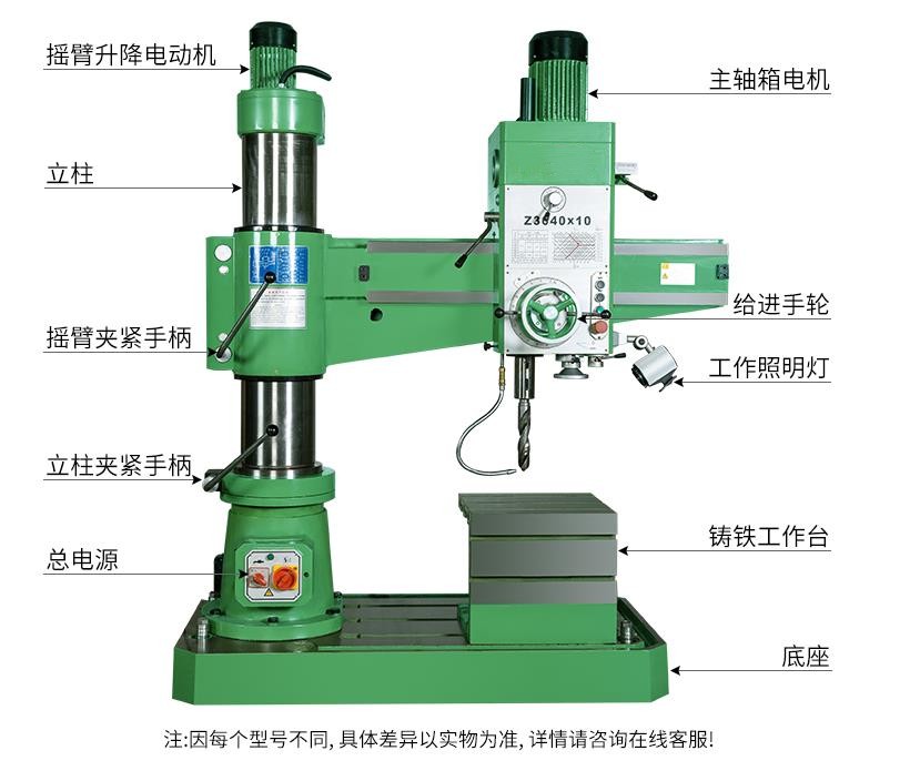 钻孔直径(mm)铸件50/钢材45, 主轴行程:220mm,立柱外径280mm,机床重量2200kg,主电机功率4KW,外形尺寸2200×950×2450。
